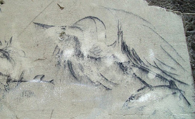 Unfinished murals are a bit like baby pigeons. Everyone knows there's a stage between blank wall and finished artwork, but rarely is the intermediate stage spotted, so it seems. The wall seems to have been painted especially for the work, and rough lines added for the main features. I hope it does get finished -- what's there already looks promising.