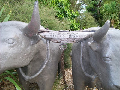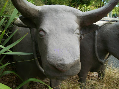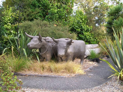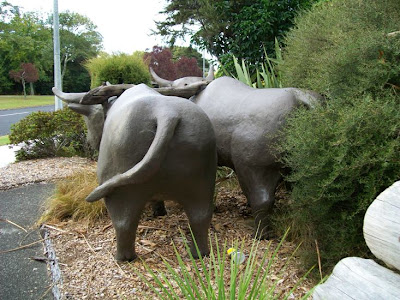 I told Trevor Pollard, President of the West Auckland Historical Society, that I was going to put the bullocks up on this blog today, and he gave me permission to include this image (below) of the bullocks, superimposed on a scene showing Mill Cottage (he had an idea to have something like the bullocks there, but the price was prohibitive). It would have been nice -- but instead, West Auckland went for their car park mural.