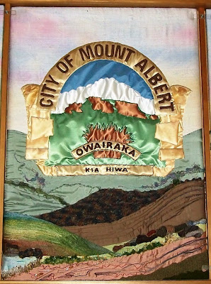The second panel shows the crest of Mt Albert City Council, absorbed into Auckland City in 1989 (just two years after this work was completed.)
