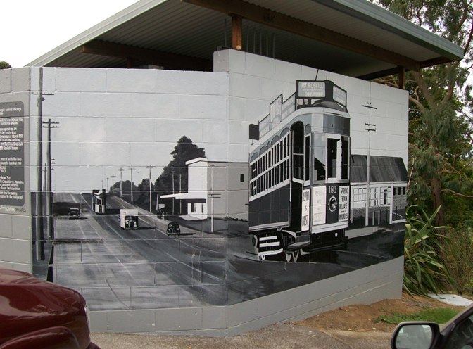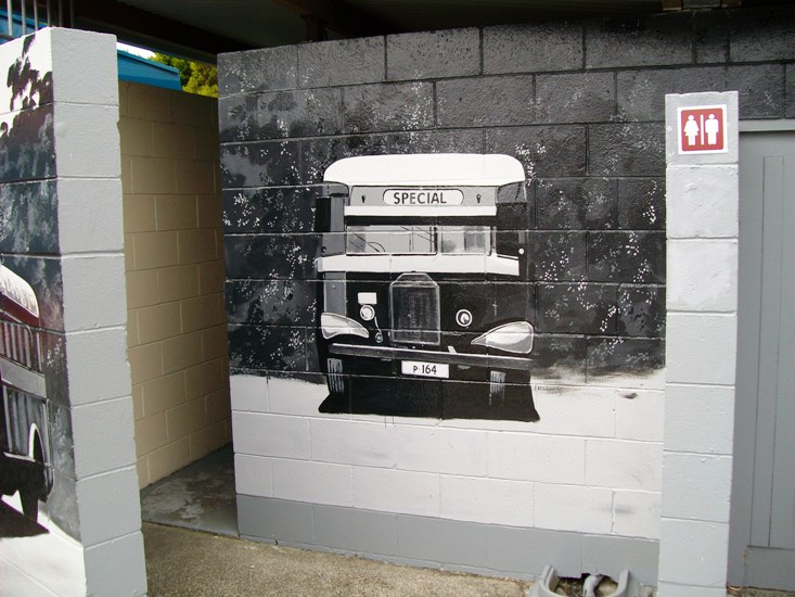 This is another of Louis Statham's artworks for local Community Board/Council projects, and features public transport in the early days of the district. A great touch is the inclusion of a piece of interpretive information, all part of the complete work.