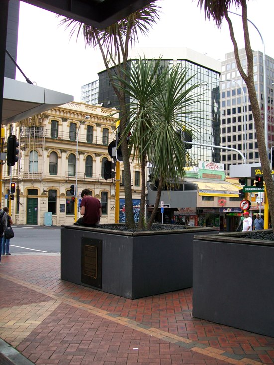 I nearly missed this plaque. It's the only one on some large square planters where cabbage trees grow at the corner of Federal and Victoria Streets. Set down low, I got onto a creaky knee and took a photo of the plaque itself.