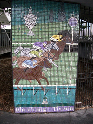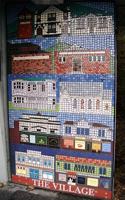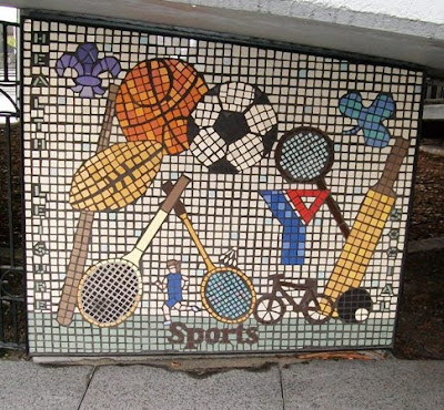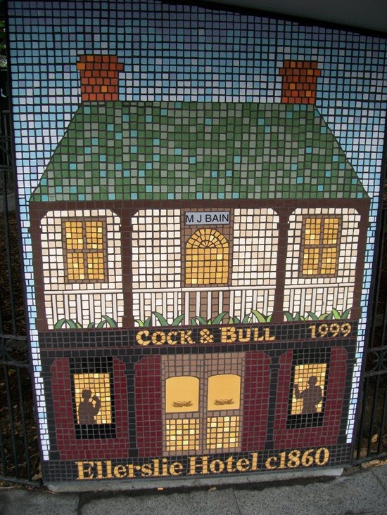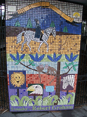 A tribute to Robert Graham's Ellerslie Gardens. They weren't a zoological gardens at all, despite what's on the mosaic -- just a sports ground and walking areas with a small menagerie of a couple of cages. So, here's an urban legend, enshrined in tiles.