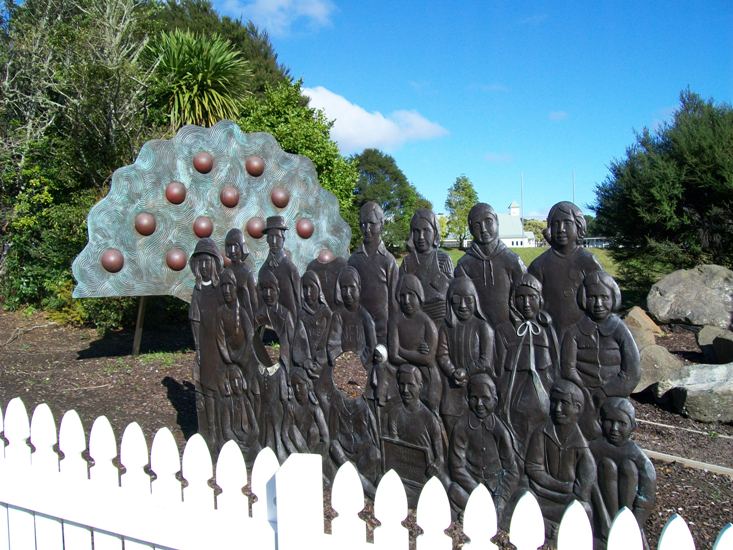 Plus, at the eastern end of the school grounds, at the intersection of Shaw and West Coast Roads, this lovely reminder of Oratia's heritage by Toby Twiss -- a fruit tree (background), and an impression of children past and present. The school dates from 1882, the sculpture from 2007, for the 125th anniversary celebrations.