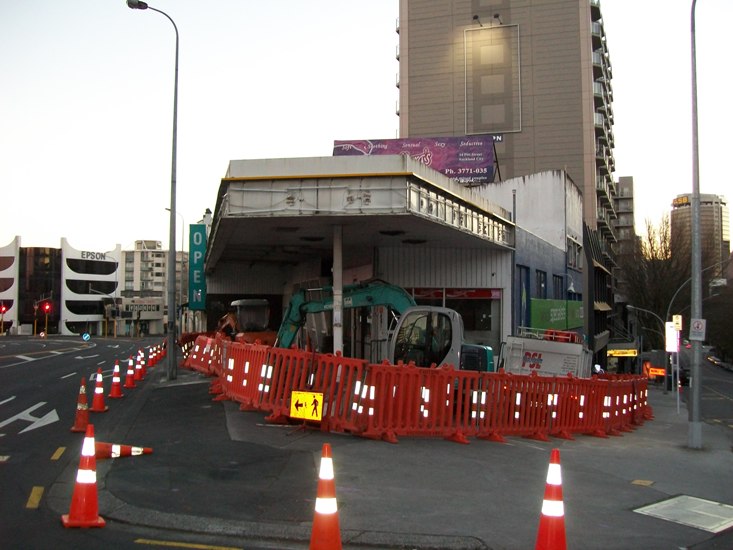 The present building probably dates from the 1960s/1970s. Before thatr, a Victorian/Edwardian block of shops was here, best seen at the Auckland City Library's Heritage Images Online pages, reference 4-2000. Wises Directories tell us a grocer and a Chinese laundry were on the site in 1905. By 1930, the block of four shops included a service station, J S Dickson & Sons, at the same corner as this one, so about 80 years or so of association with petrol and motor vehicles has come to an end.