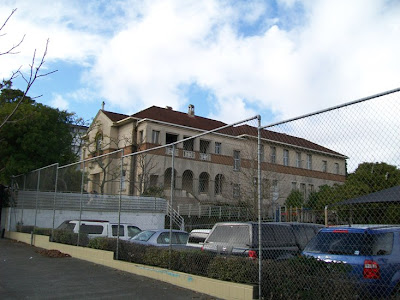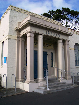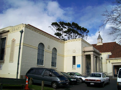 ... up the hill to the Grey Lynn Library (brilliant local history collection and display in an alcove inside, last time I knew. Check it out.) This was originally a site purchased by Auckland City for waterworks purposes. W H Gummer designed this 1923 building which has at least twice survived closure proposals and still provides the community valued service.