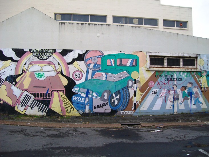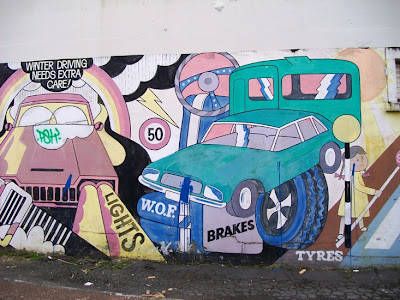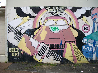 This mural, alongside the remaining bit of the old electric bus turn-around off upper Rosebank Road, is around 20-30 years old, I reckon. I've seen it for years. The back door in the photo on the right leads to what started out as the Avondale Plunket offices from the 1940s when this (the local loos) was built. Plunket moved out in the 1980s, wanting more space. And probably something less drafty -- my mum often told me that the reason why I wasn't a "Plunket baby" in the 1960s was because of one visit she made with me to see the nurse there. Through lack of room, after the check-up and weighing etc, she was asked by the nurse to dress me in the drafty corridor. Mum never went back there with me again.