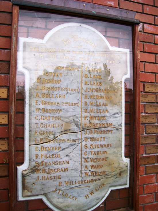I went to Avondale Primary School, 1968-1974. During the demolition of the old school buildings, the marble plaque was removed, and reappeared in a window display in the old dairy on Layard Street, part of the RSA complex by that stage. It was there for two decades before the RSA had their own redevelopment, the recessed doorway and window from the old dairy (where the school children of years long gone by used to get their penny ices on the way home) were removed and replaced with blank wall, and the plaque found a new home outside, beside the artillery piece which forms the RSA's memorial gardens, still on Layard Street. It can be seen there to this day, but loses some of its context outside of the school buildings. It forms the only World War I memorial to the fallen in Avondale.