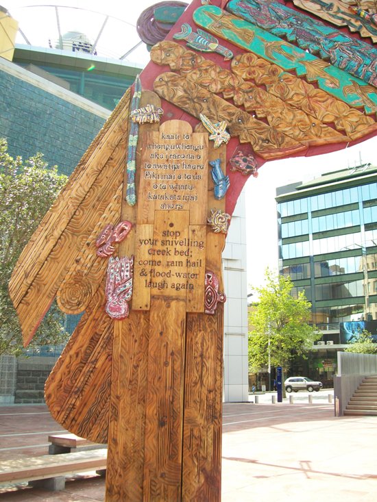 It includes Hone Tuwhare's (1922-2008) haiku which was changed slightly when used in an Auckland City Council sculpture project on the footpath just up from the Civic Theatre, to celebrate the (now) hidden Wai Horotiu, Queen Street's lost stream. Tuwhare's haiku (about a general stream, not necessarily the Horotiu) seems to have just been in English in its original form. Was a Maori translation added by Selwyn Muru on the scuplture in Aotea Square, or is the Maori text something else?