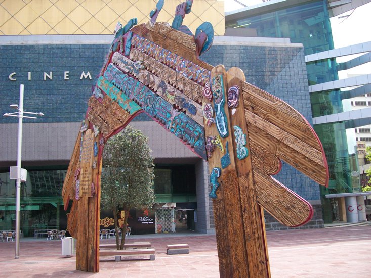 Te Waharoa o Aotea (1990) has seen drabber days of existence, such as here, and here. Not any more, though. Artist Selwyn Muru, in honour of the reopening of Aotea Square, has added to the sculpture, and coloured it up. I like it.