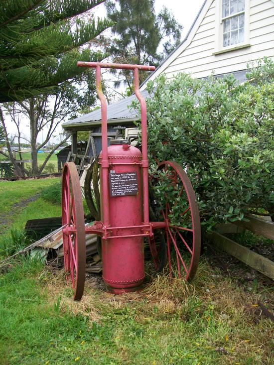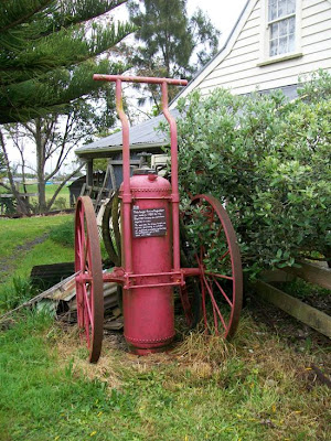 A fire extinguisher. "This large fire extinguisher was made in 1920 for the Shell Oil Company when petrol was imported in cans. To operate, the brass handle was turned, puncturing a cylinder of oxblood, producing a yellow foam that extinguishes petrol fires. Used until 1985." (!!)