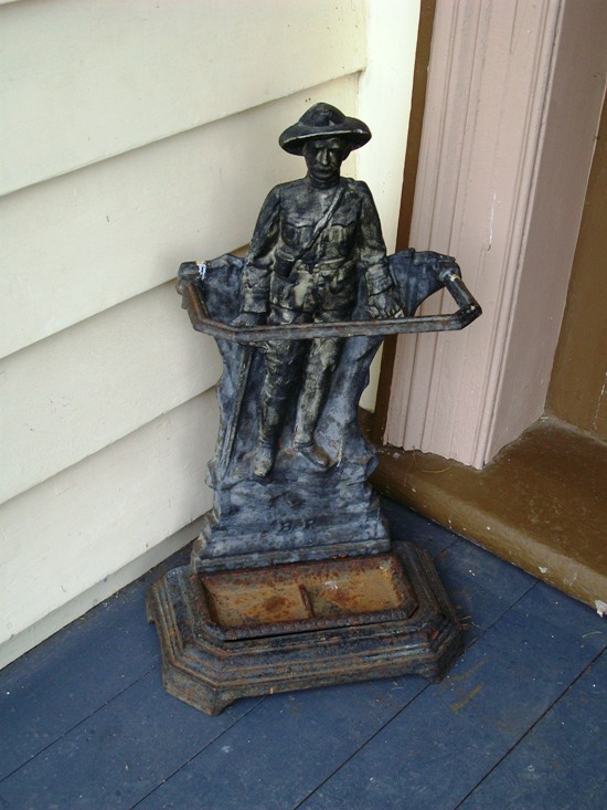 This wee bloke, forever guarding the wet umbrellas, looks a bit Boer War era to me.