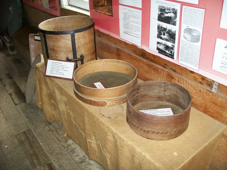To the right is a peck measure, and to the left one for the bushel. In the middle is a sieve.