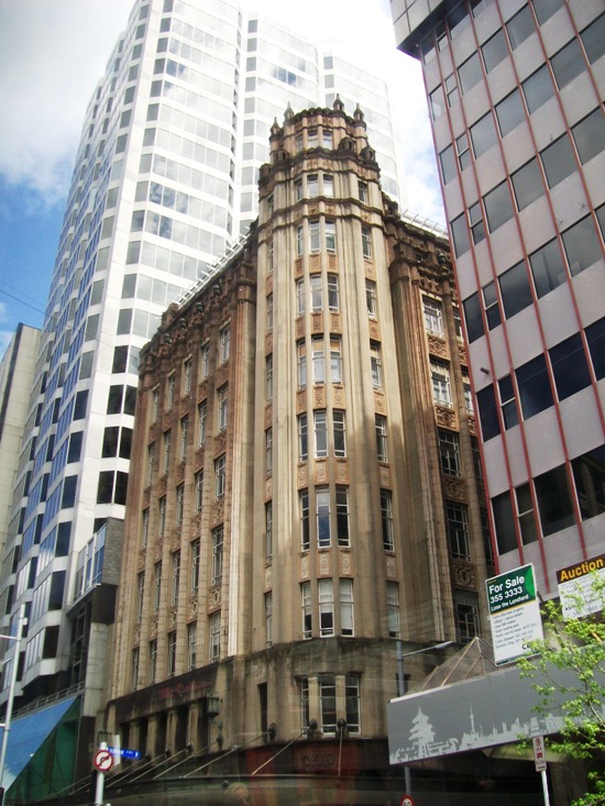 Overshadowed by modernity on either side, the 1930 former Auckland Electric Power Board Building, now known as Landmark House, still manages to hold its own. This is a quick photo taken last Friday from inside a briefly paused bus up Queen Street. It has Category 1 registration with NZ Historic Places Trust, which have more info on it here.