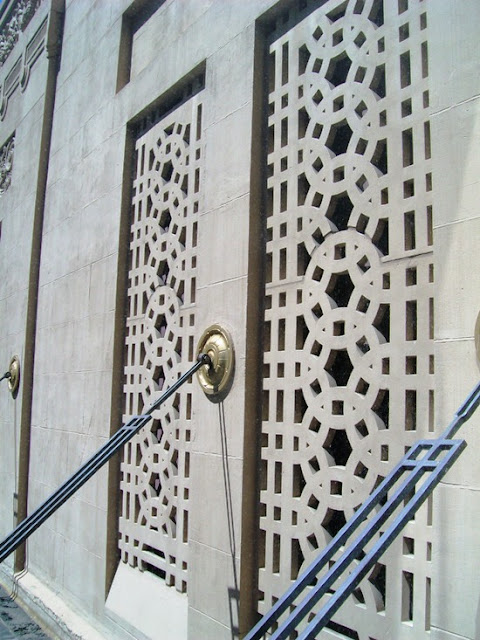 Behind the concrete lacework, George told us there were originally neon lights. They've had to be removed over time, and now the darkness seen through the lace isn't a cavity anymore, but a purple-painted backing.