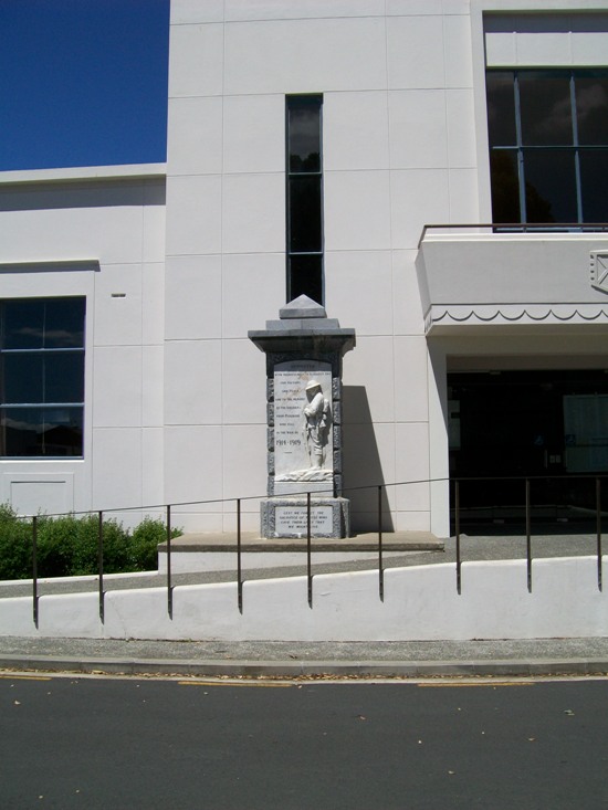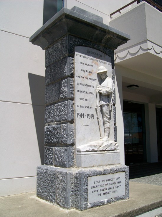 On 6 November 1921 Prime Minister William Massey unveiled the Pukekohe First World War memorial. The war memorial gates were situated on a plot of land donated by Mr William Roulston on the eastern side of the railway line. They included a column inset with a bas relief sculpture of a soldier, for which a local returned soldier, W.J. (Bill) Short, had reputedly served as the model. In April 1980 the memorial column was relocated from Roulston Park to the Pukekohe War Memorial Town Hall to enable the town's commemorative ceremonies to be held on a single site. During the 1980 Anzac Day ceremony, Mr Short laid a wreath on behalf of the First World War veterans present.