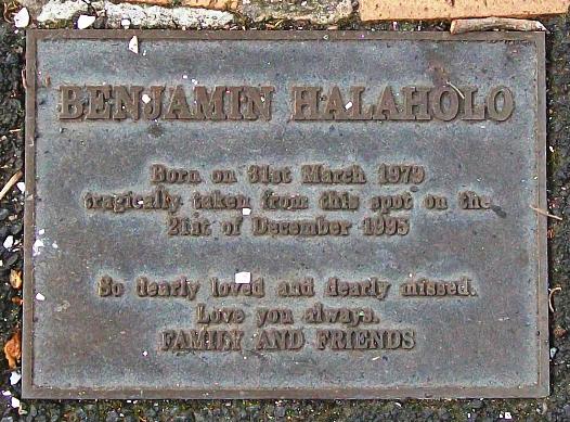 "Benjamin Halaholo, born on 31st March 1979, tragically taken from this spot on the 21st December 1995. So dearly loved and dearly missed, Love you always, Family and Friends."