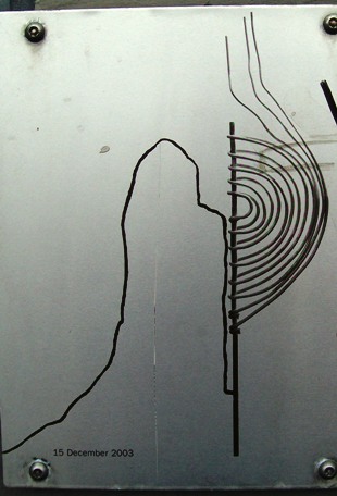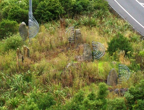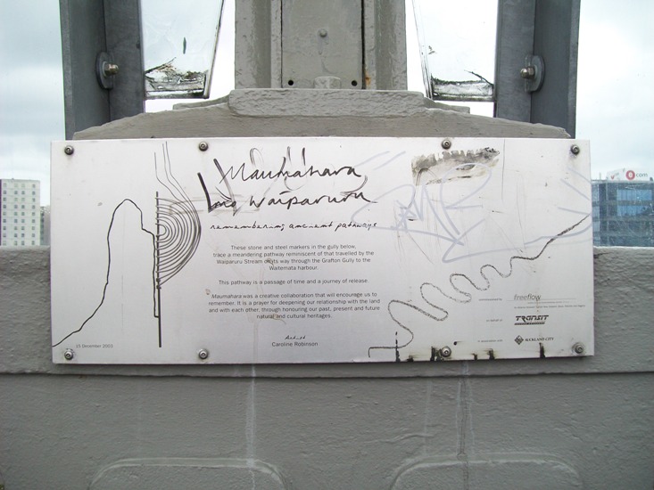 These stone and steel markers in the gully belowtrace a meandering pathway reminiscent of that travelled by theWaiparuru Stream on its way through the Grafton Gully to theWaitemata harbour.