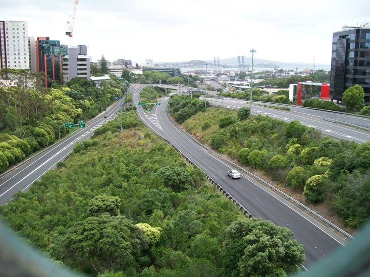 Peering through one of two holes cut through the protective shielding (said shields designed to stop suicides and other projectiles from off the bridge to the motorway below) ...