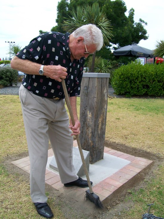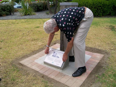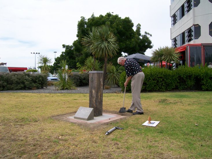Today, Trevor was only able to affix a temporary version of the sign to the plinth. The concrete still needs to cure, then a permanent version will be fastened on. The capping, by the way, is Trevor's own voluntary work, in his other role in life as a master plumber.
