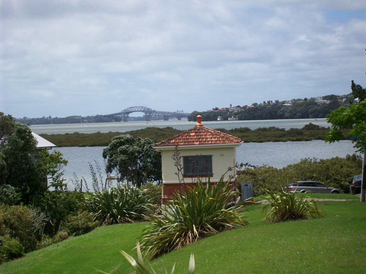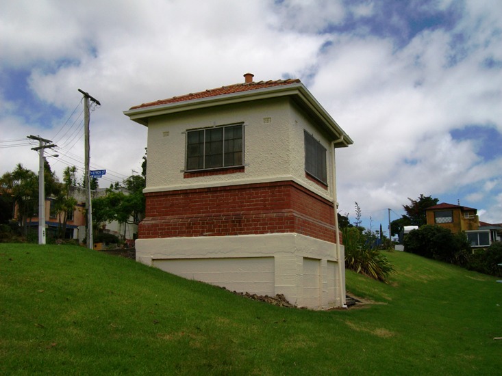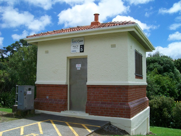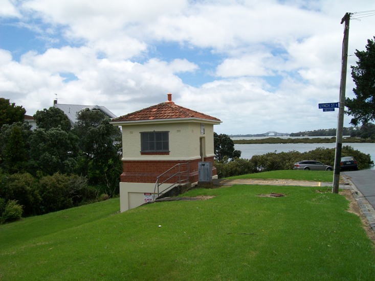 This is a small yet quite beautiful (considering its purpose) example of municipal architecture. Apparently built sometime before 1940 (it shows up in the aerials of that time), it may be part of the overall engineering of the old Auckland Drainage Board, long since replaced by other bodies. It is definitely a room with a view.