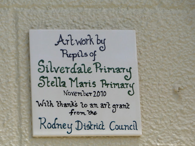 My friends Bill and Barbara Ellis sent through these photos of a lovely mural (2010) on the side of a toilet block in Silverdale. School children painted flowers on tiles, which have been fixed to the wall, with leaves and stems painted on the wall itself. A beautiful idea.