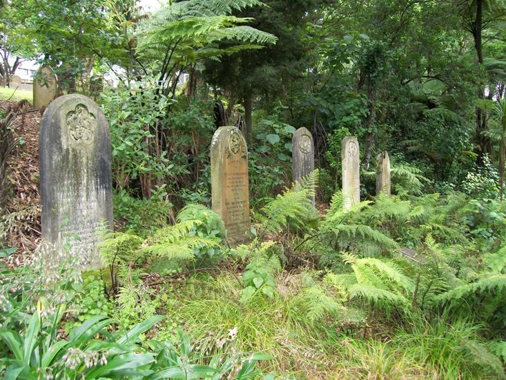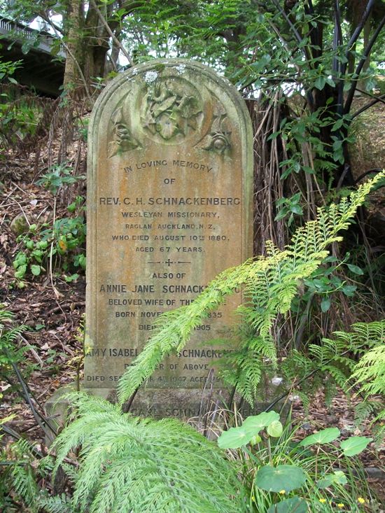 When the first of this set of graves was dug here, that of Rev Cort Henry Schnackenberg in 1880, this would have been a peaceful part of the slope down to the bottom of Grafton Gully. Native bush and bird song all around, fitting for the last resting place of those who laboured as missionaries for years in the back blocks of this country's early days. Today, of course, on the other side of the overgrowth below is the motorway. How times change.