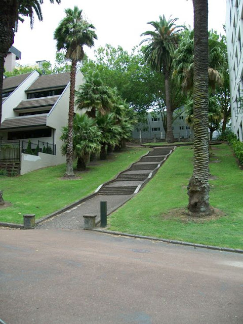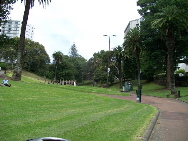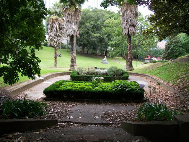 One of my favourite spots in Auckland is Myers Park. If you walk through St Kevin's Arcade in Karangahape Road (site of St Kevens, the home of the Nathan family in the 19th century), down sets of wide stairs which still give me pause (I'm sure each step slopes downward a little), you will therefore start from the top and be able to see wonderful views of the paths, green and public art in the park.