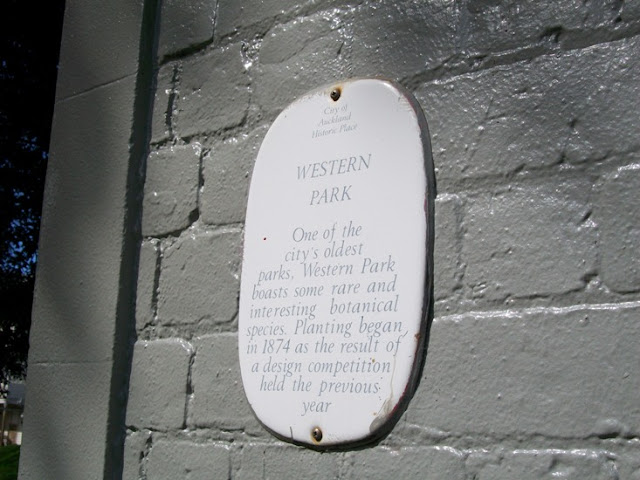 Just about the only thing it seems to be good for these days, sadly, is sport grey anti-graffiti paint and one of Auckland City's heritage plaques, this one just for the park in general, not the poor old loo (that's just about the only thing the anti-graffiti team won't cover with their grey on a paint-out -- but as you can see, the brush strokes come close ...)