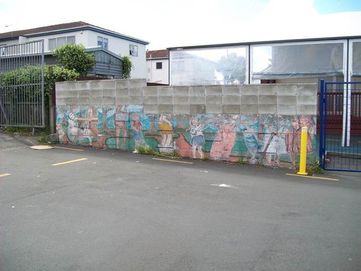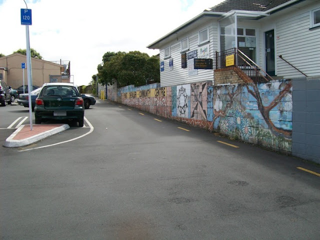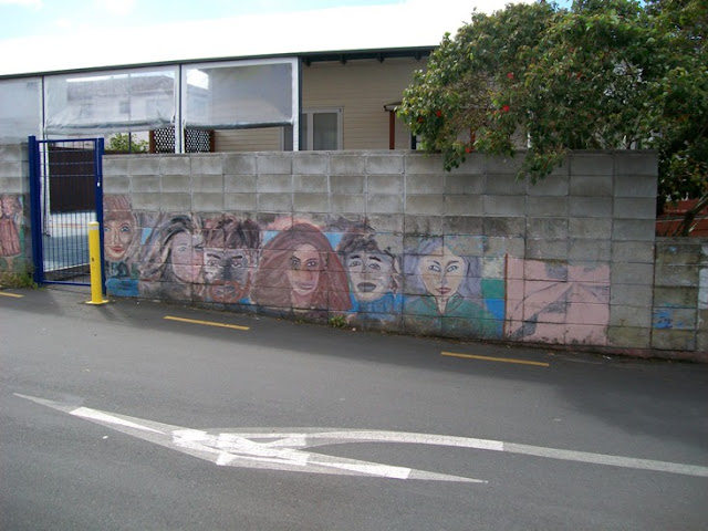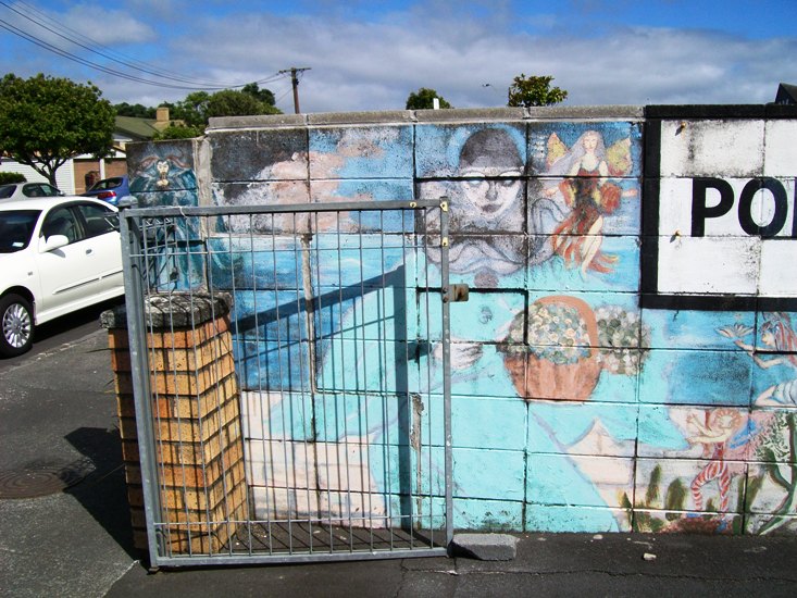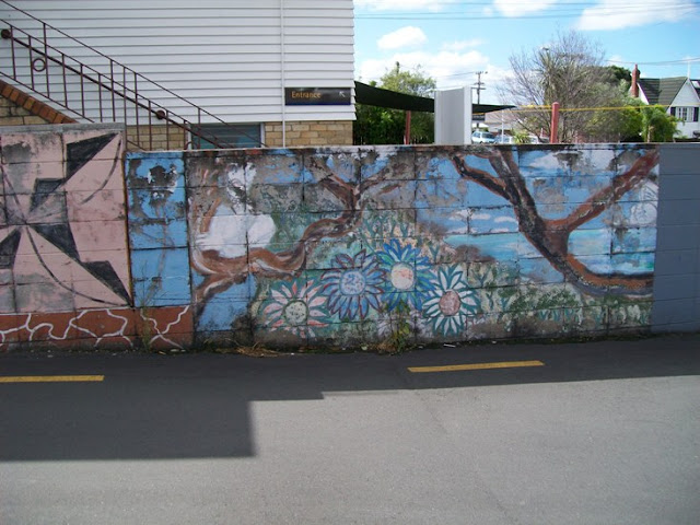 Off Huia Road at Pt Chevalier is a wall, between the supermarket carpark and the local community centre. While yes, I do photograph murals, fading and otherwise, and hope they don't vanish, truly -- this one has seen much better days.