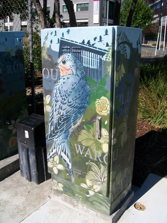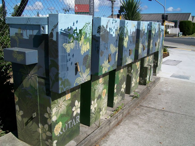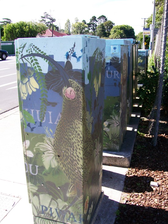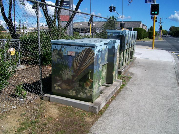 This set of power boxes are on Henderson Valley Road, between Great North Road and the entry to the train station. Very hot day last Sunday, I was in the midst of a trudge down from Sturges Road to the interchange to get a bus home, when I spotted them. This sort of thing is fairly well down to force of habit. No matrer how hot, bothered and knackered I was, I had to spot, fish for the camera, and take shots for the blog. Then headed around the corner, up the stairs (puff, puff), across the walkway, down the escalator, and my bus was virtually waiting there. The birds may have brought me luck.