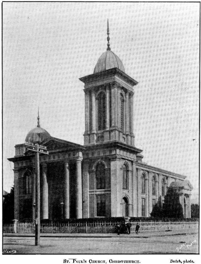 St. Paul's Presbyterian Church, Christchurch.This is one of the finest churches in the city. It has sitting accommodation for 1000 persons. The interior of the church is very handsome and striking, but, like all Presbyterian churches, devoid of much internal ornamentation. There is a fine organ, which cost £800, and the choir is one of the best trained in Christchurch. A handsome room has recently been built and opened in connection with the church, for holding a young men's Bible class, which numbers eighty-four. Both St. Paul's Church and manse are now well nigh free from debt.