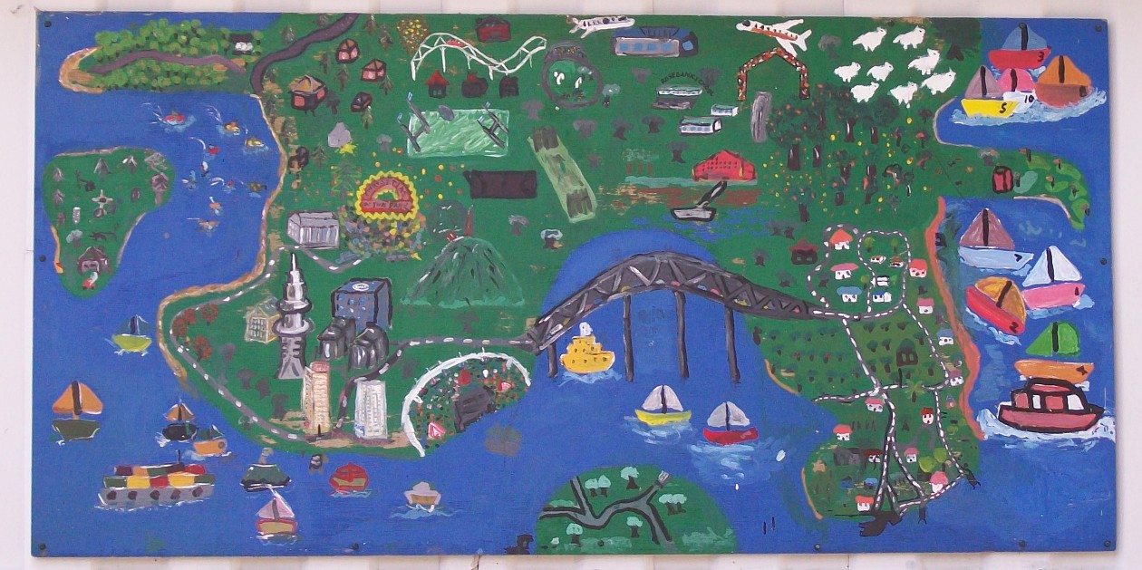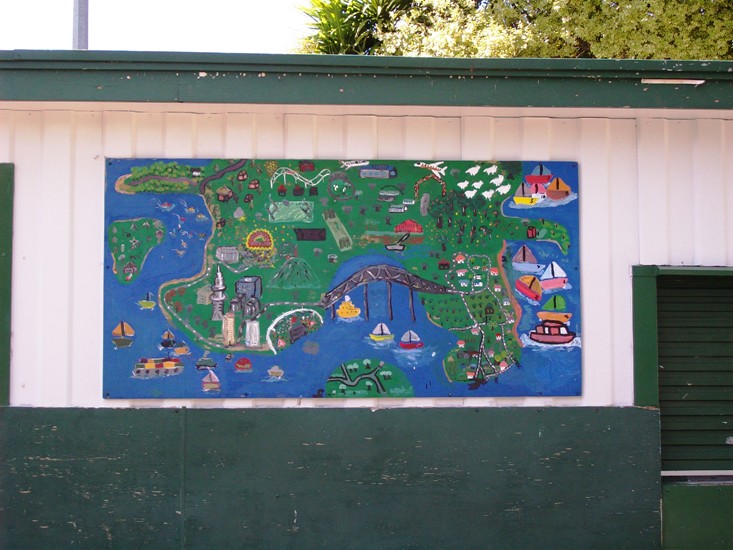 One of the school's murals on the grounds. If you look carefully, just between the two planes and a bit below, you'll see the school included on the Auckland landscape.