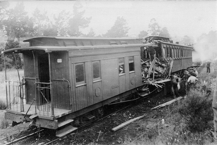 A passenger train from Henderson (thirteen miles from Auckland) and a train from Auckland collided on the railway bridge at New Lynn at 6.50 this morning. Two carriages were telescoped, and both engines were badly damaged.