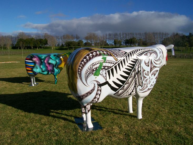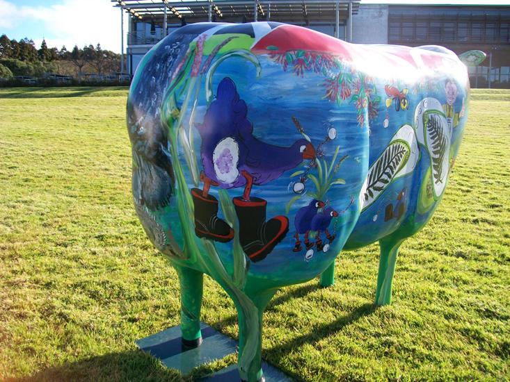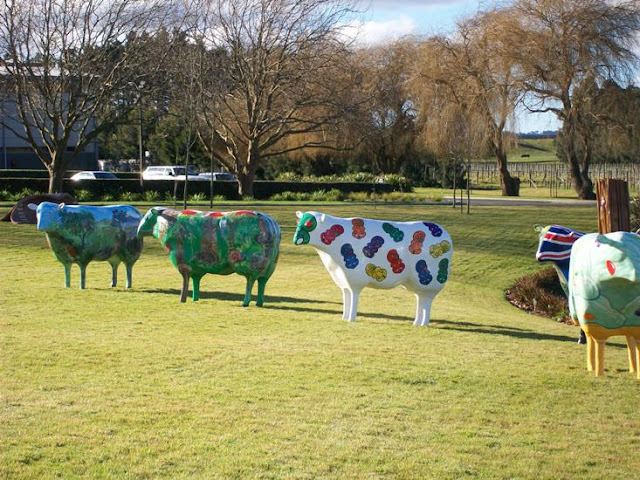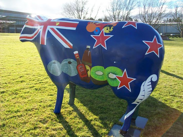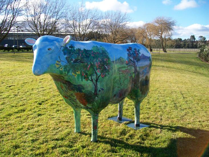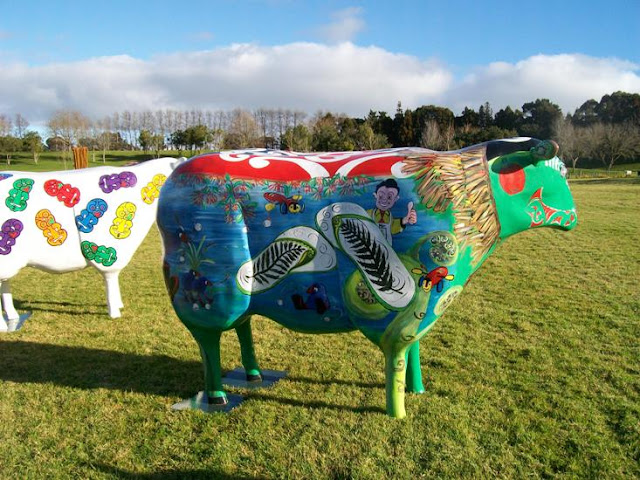 There -- a group of painted sheep (very large sheep, so large they seemed more like cows, but Liz at Mad Bush Farm has rightly corrected me. The previous post was deleted), decorated with various aspects of Kiwiana, landscapes, native flora and fauna and other designs caught my eye. Given the opportunity to photograph them, I took it.